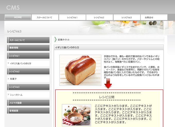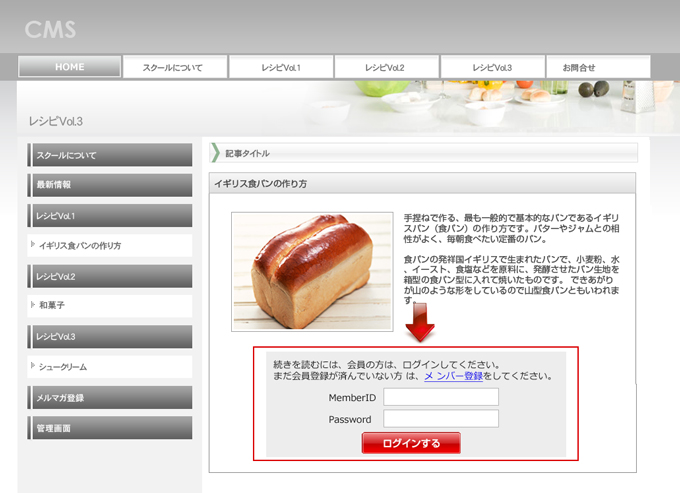 | ログイン後は、一般表示エリアの下部に、会員限定コンテンツを表示させます |