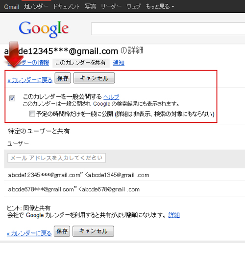 | 【Googleカレンダーの設定】 「このカレンダーを一般公開する」にチェックを入れて保存します。 |
