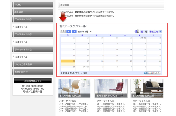 | 以下はイメージ例です Googleカレンダーの表示位置を変更したい場合は、 TOPページメイン部分の表示順を変更するを参照してください。 |