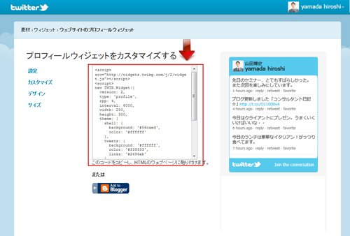 | 【Twitterの設定】 ウィジェットのタグコードが表示されます。 表示の色やサイズはこのウィジェトカスタマイズ画面で行ってください。 横幅(width)は630pxまでに設定してください。 ⇒詳しくは Twitterヘルプセンター を参照してください (仕様が変更される場合があります) |