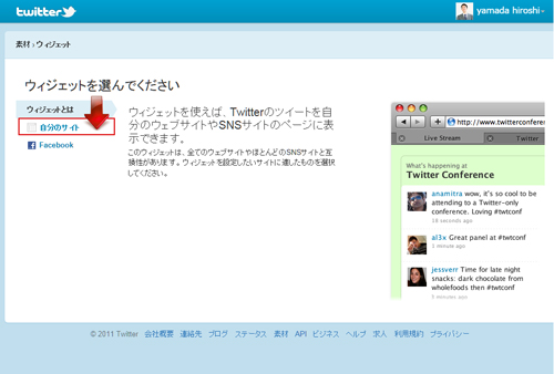 | 【Twitterの設定】 「ウィジェットを選んでください」画面で「自分のサイト」をクリックします。 |
