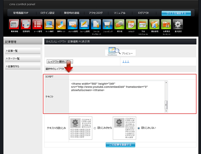 テキスト編集BOX内に、YouTubeのタグを貼り付けて、「この記事を登録する」ボタンをクリックします。