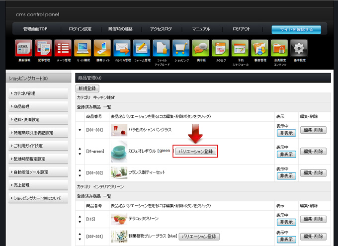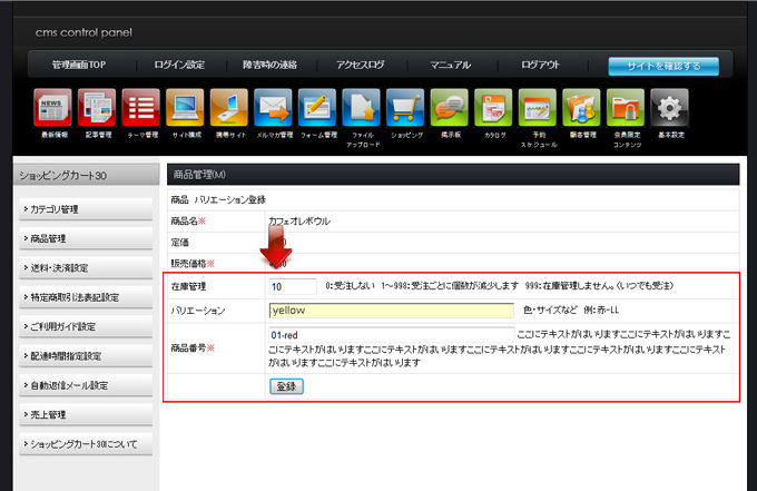 HOME» ショッピングカート30 »【商品管理】商品のバリエーションを登録する