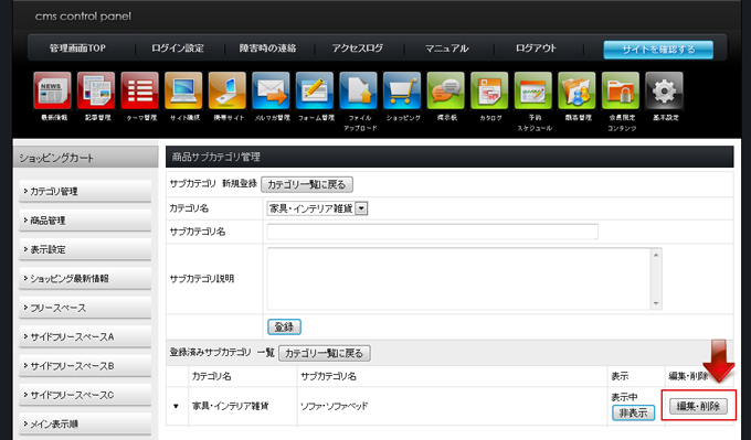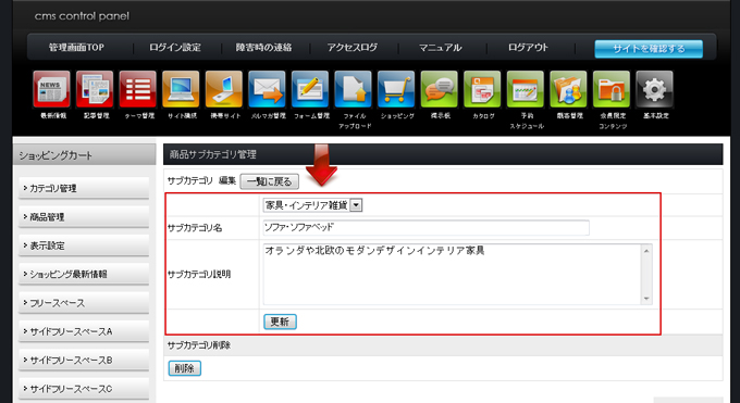 | サブカテゴリ編集画面で、編集(または削除)して更新します。 ⇒サブカテゴリが所属するカテゴリを変更することもできます。 |