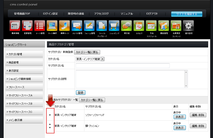 | サブカテゴリの順番を変更したい場合は、サブカテゴリ一覧の▲▼を移動して変更します。 |