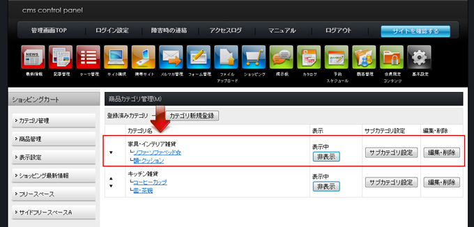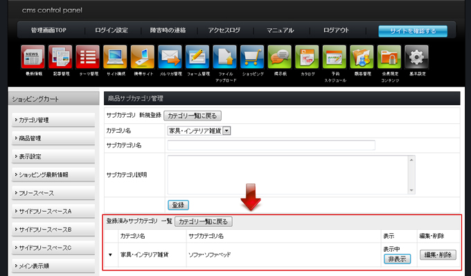 | 登録したサブカテゴリは、サブカテゴリ管理に一覧表示されます。 |