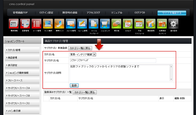 | サブカテゴリ編集画面で、サブカテゴリ名とサブカテゴリ説明を入力し登録します。 |