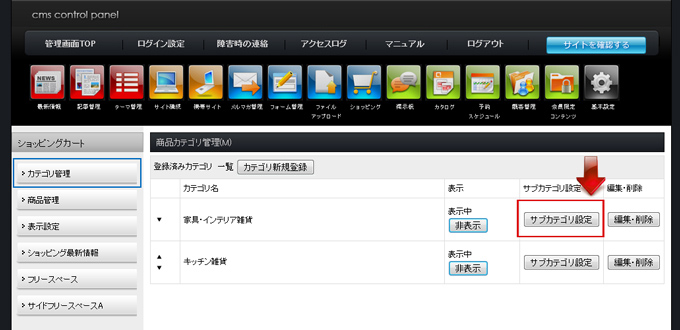 | 「カテゴリ管理」から、サブカテゴリを設定したいカテゴリの「サブカテゴリ設定」をクリック |