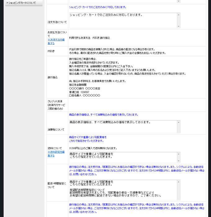 この「特定商取引法表記設定」では特定商取引法に関する表示に必要な項目の設定ができます。