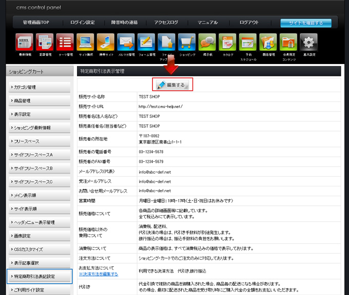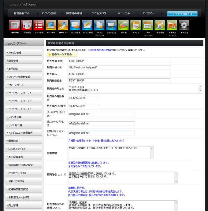 HOME» 【有料オプション】ショッピングカート »【基本設定】(1)特定商取引法に関する表記を設定する