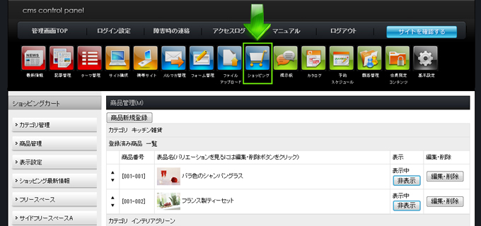⇒送料の設定・決済方法の選択・消費税の設定変更は「送料・決済設定」で予め行ってください。