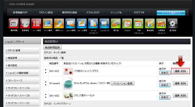 | 商品管理画面で、画像を追加・編集したい商品の「編集・削除」をクリックします |