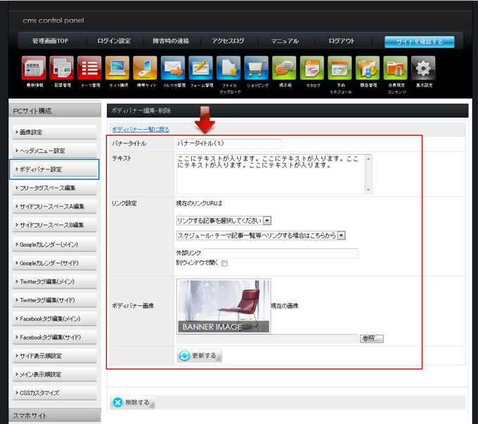 | ボディバナー編集画面が表示されます。 編集後、「更新する」をクリックします。 |