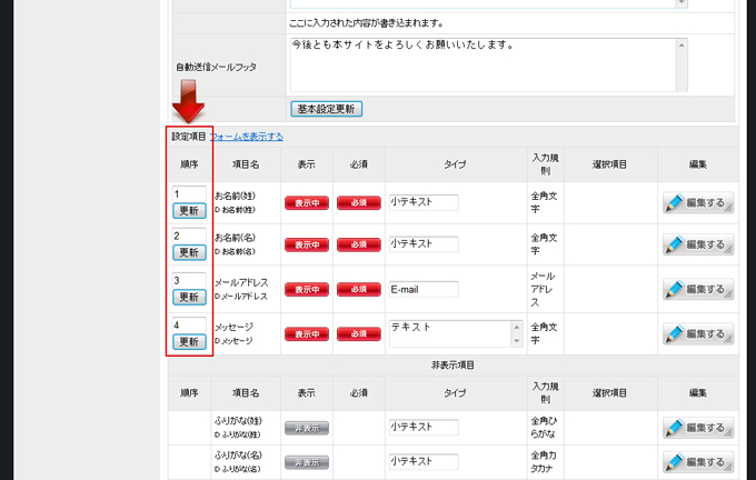 | 「メルマガ・会員登録フォーム」では、表示中の設定項目順が表示されています。 変更したい順番を「順序」に入力して「更新」します。 |