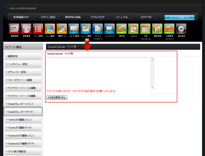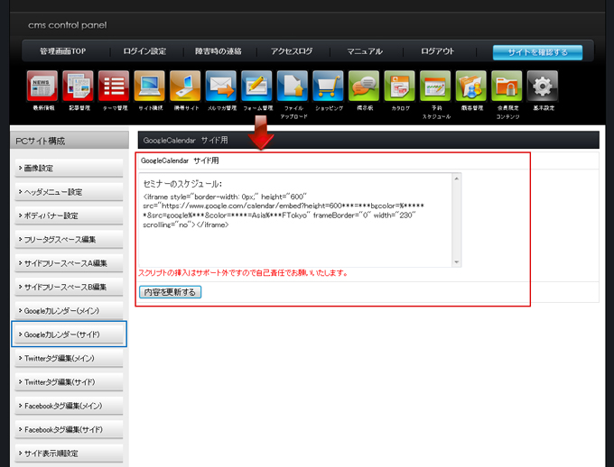 | サイト構成から、「Googleカレンダー(サイド)」を開きます。 ここにお使いのGoogleカレンダーの埋め込みタグを挿入します。 |