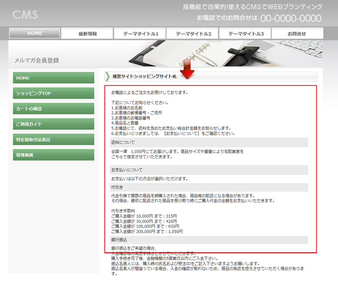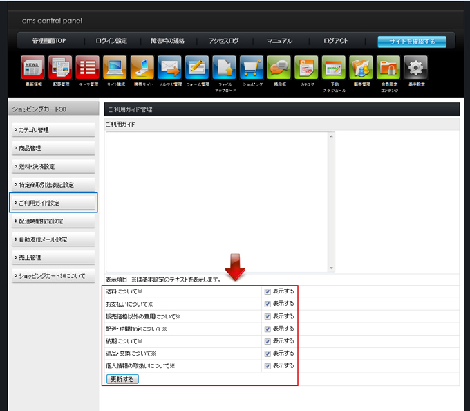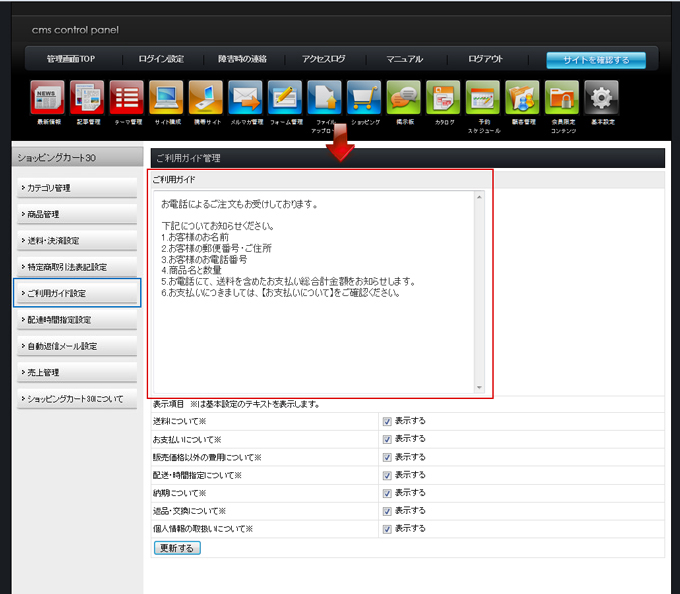 HOME» ショッピングカート30 »【基本設定】(5)「ご利用ガイド」ページを設定する