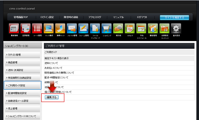 | 「ショッピングカート30」から「ご利用ガイド設定」を開き、「編集する」をクリックします。 |