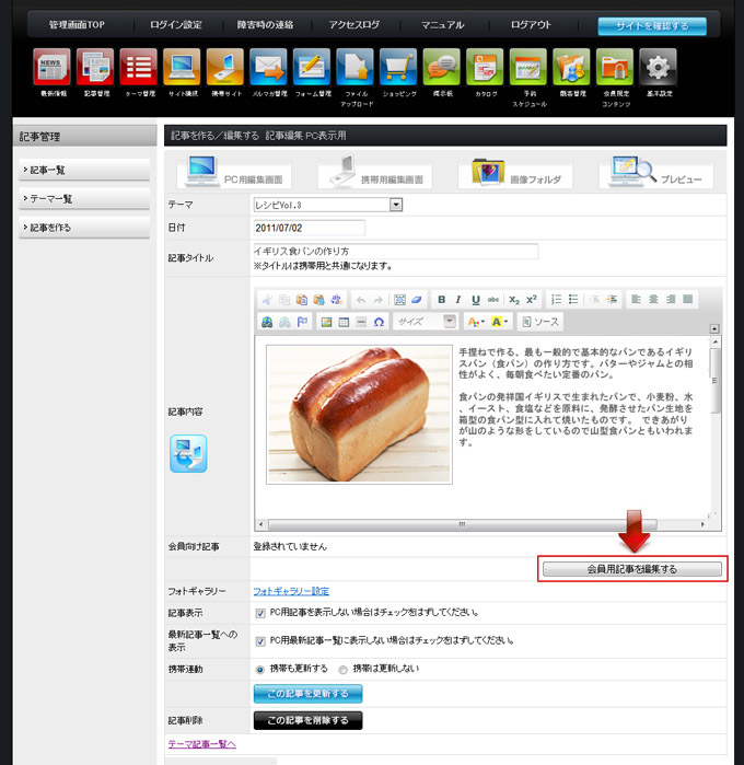 | 会員記事内容編集画面のエディターで内容を登録、「会員記事を更新する」をクリックします。 |