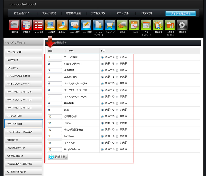 | サイドの配置は、「サイドメニュー表示管理」で変更できます。 変更したい順を入力して「更新」してください。 |
