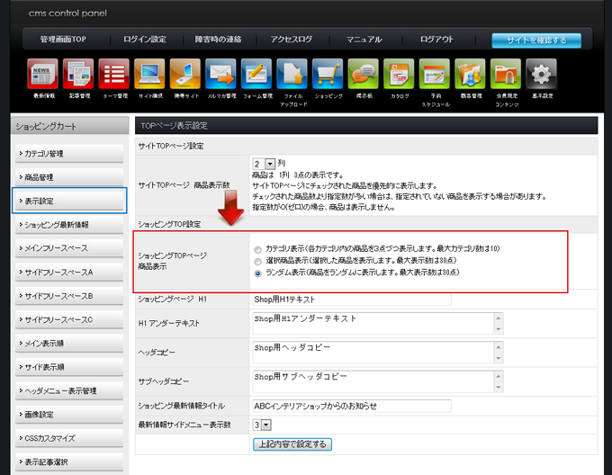 | ショッピングTOPページの商品表示設定 |