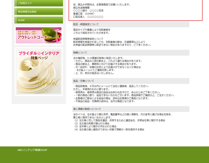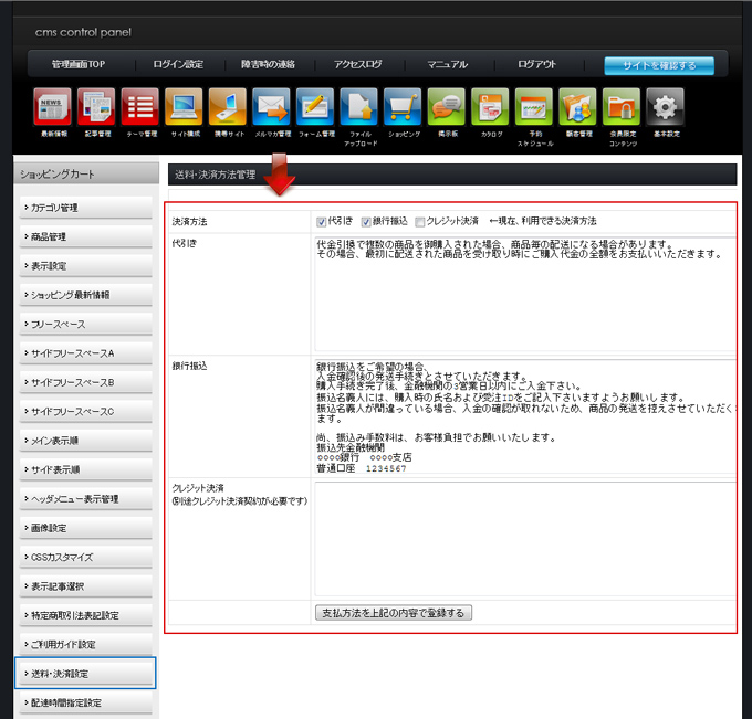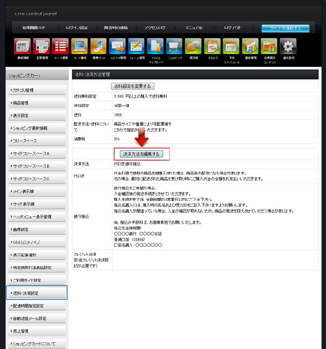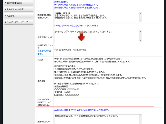 | 決済方法を、「代引き」「銀行振込」「クレジット決済」から、対応できる決済方法を選んでください。 それぞれの条件や詳細内容を記載します。 【代引き】⇒宅配業者との契約が必要です。契約された業者の条件や詳細を記載してください。 【銀行振込】⇒予め初期設定で入っている文章を例に、必要な内容を編集・追加してください。 【クレジット決済】 ⇒別途クレジット決済代行会社との契約が必要です。 契約後、サポートまたは販売店にご連絡ください。(別途クレジット決済システムとの繋ぎこみが必要です) |