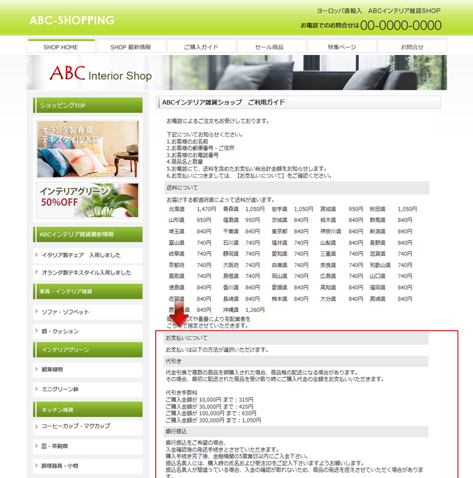 | ショッピングページの「ご利用ガイド」に表示されます。 ↓表示例 |