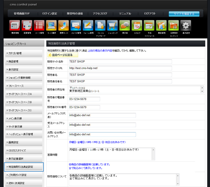 | 「送料・決済方法管理」で登録された内容は「特定商取引法表示」に表示されます。 |