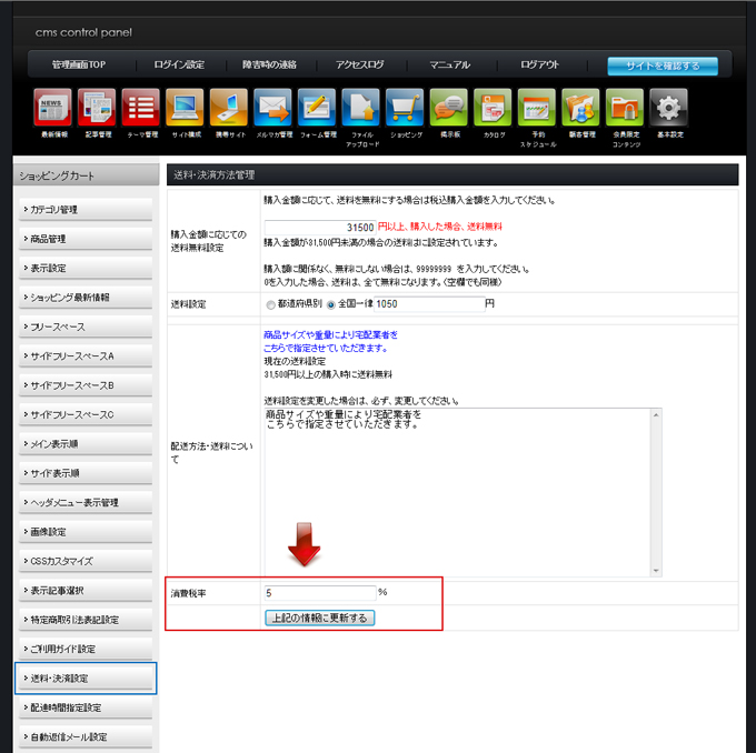 | 【送料・決済方法管理】画面、一番下の、「消費税率」を変更します。 |