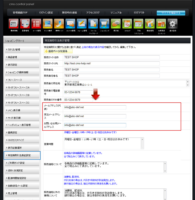 | まず、特定商取引法表示管理画面で「受注メールアドレス」を確認してください。 |