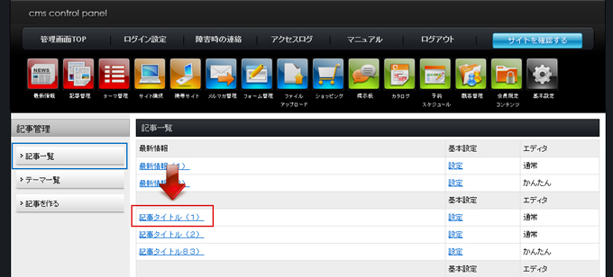 | 「記事一覧」から、編集したい記事のタイトルをクリックします。 |