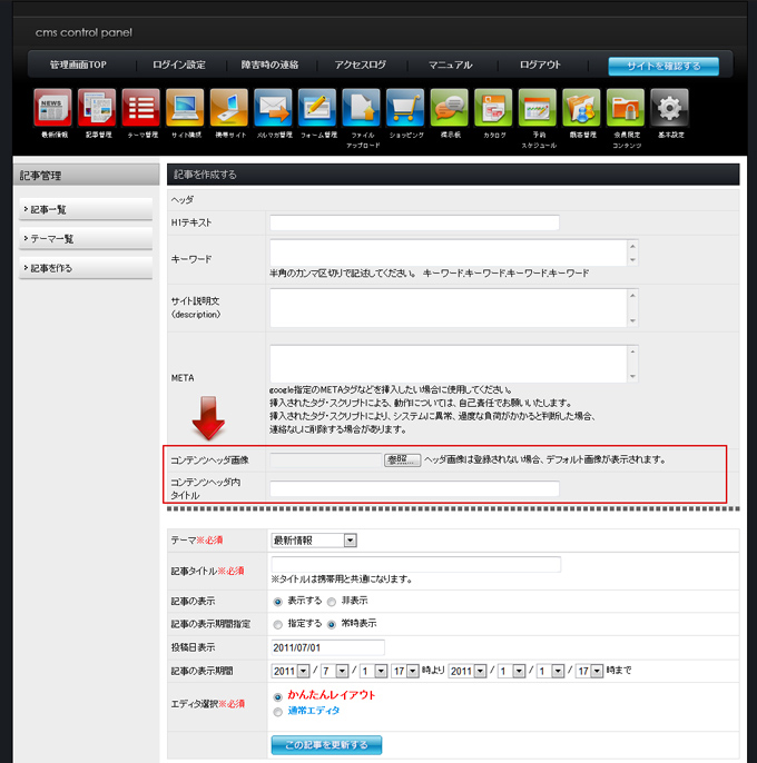 | 基本設定画面でコンテンツヘッダの画像をアップロードして、「この記事を更新する」をクリックします。 コンテンツヘッダ画像内に表示する「コンテンツヘッダ内タイトル」もこちらで登録できます。 |