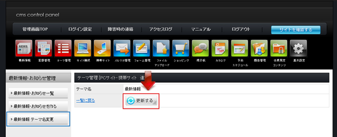 | 最新情報・お知らせ管理画面で、テーマ名を確認、「更新する」をクリックします。 |