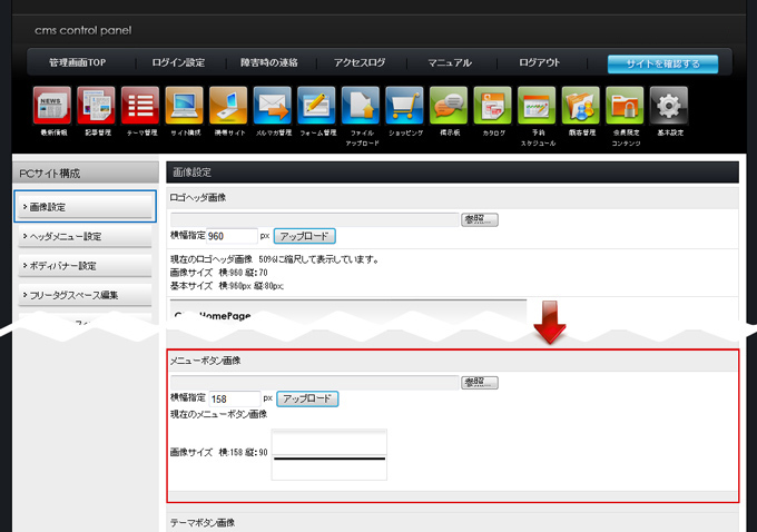 ヘッダメニューボタンの画像サイズが表示されていますので、サイズに合わせて画像を作成、登録してください。