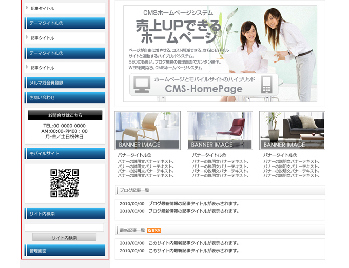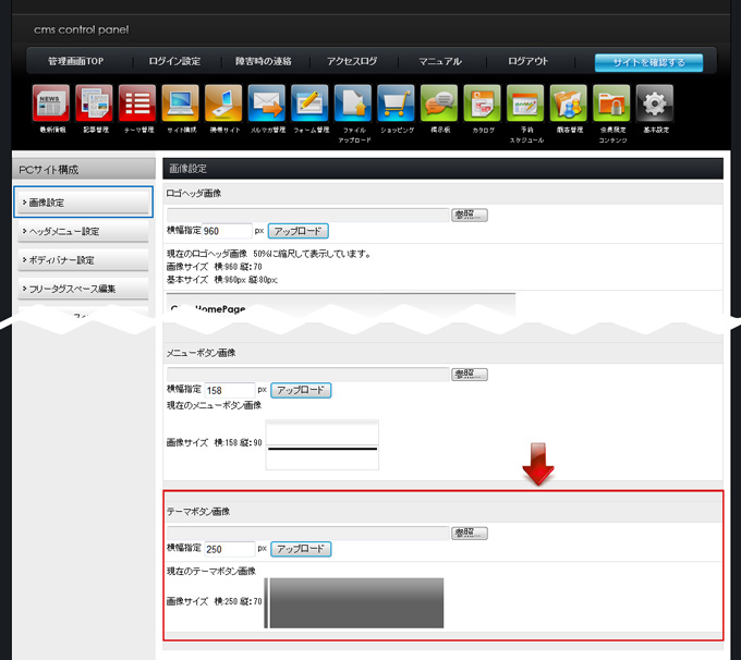 | 「画像設定」を開きます。現在登録されているテーマボタン画像が表示しています。 テーマボタンの画像サイズが表示されていますので、サイズに合わせて画像を作成、登録してください。 ⇒サイズの違う画像を登録する場合、画像のサイズに合わせて表示させるにはCSSを変更する必要があります。 |