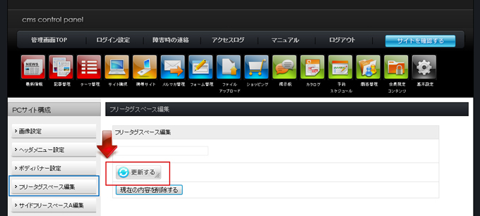 サイト構成画面から、「フリータグスペース編集」を開き、「更新する」をクリックします。
