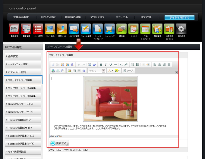 フリータグスペース編集画面の通常エディターで内容を編集し、「更新する」をクリックします。