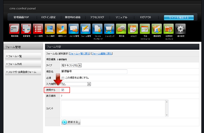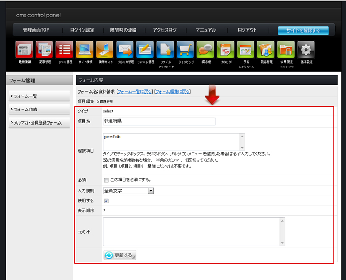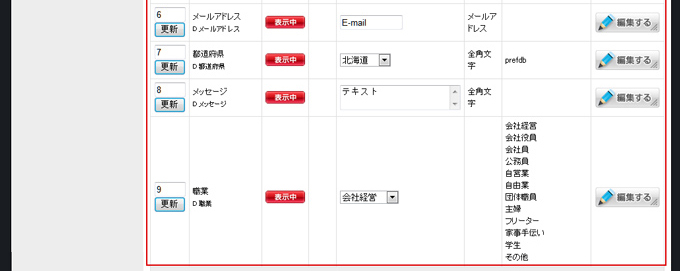 | 項目編集画面で項目名や選択項目・入力規則・必須にするかどうか・使用するかどうかを編集できます。 編集後は「更新する」をクリック、「フォーム編集に戻る」で戻ります。 |