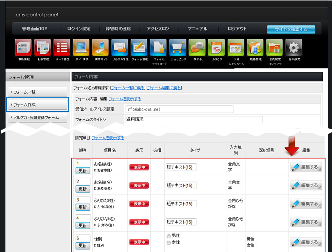 | フォーム項目を編集したい場合は、設定項目で、編集したい項目の「編集する」をクリックします。 |