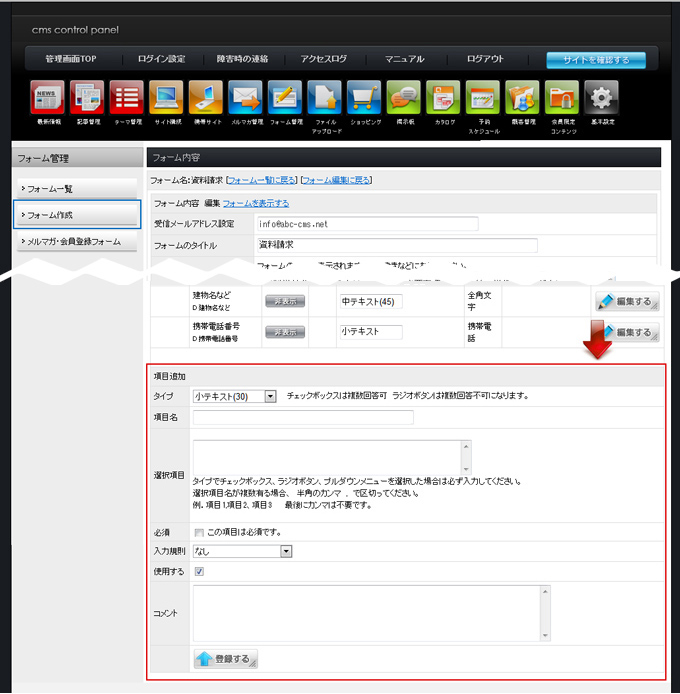 | フォーム編集画面に戻りさらに項目を作成したい場合は、 下記「項目追加」で追加します。 |