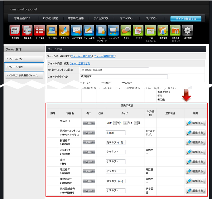 | フォーム編集画面に戻り、項目を追加したい場合は 非表示項目から追加したい項目の「編集する」をクリックします。 |