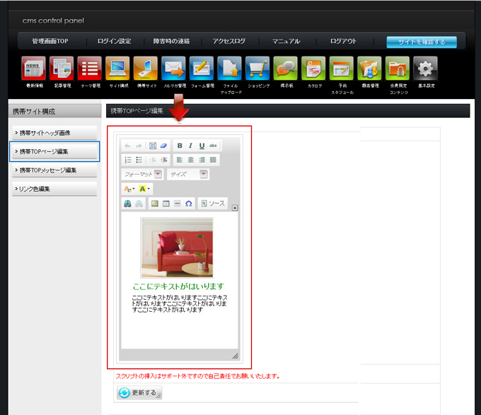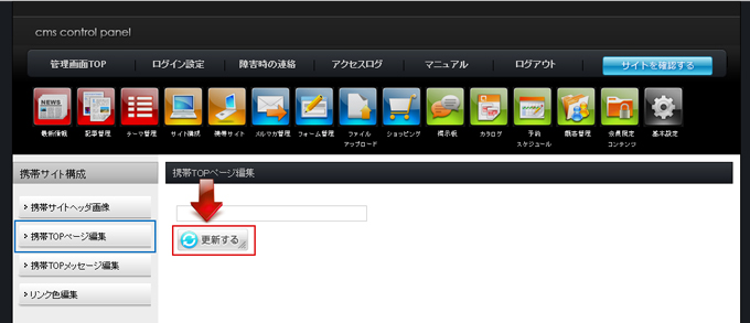 | 携帯サイト構成から「携帯TOPページ編集」を開き、「更新する」をクリックします。 |