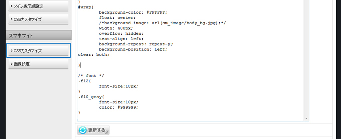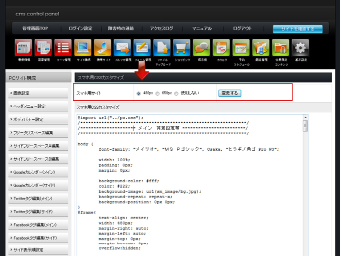 | サイト構成の「スマートフォンサイト」からCSSカスタマイズで、画像の表示サイズを変更できます。 初期設定では、予め横幅480pxに設定していますが、テーブルタグなどで記事を制作される場合は、650pxに変更されるとレイアウトの崩れも少なくなります。650pxに変更される場合は、下記のCSSの該当タグも変更してください。 |